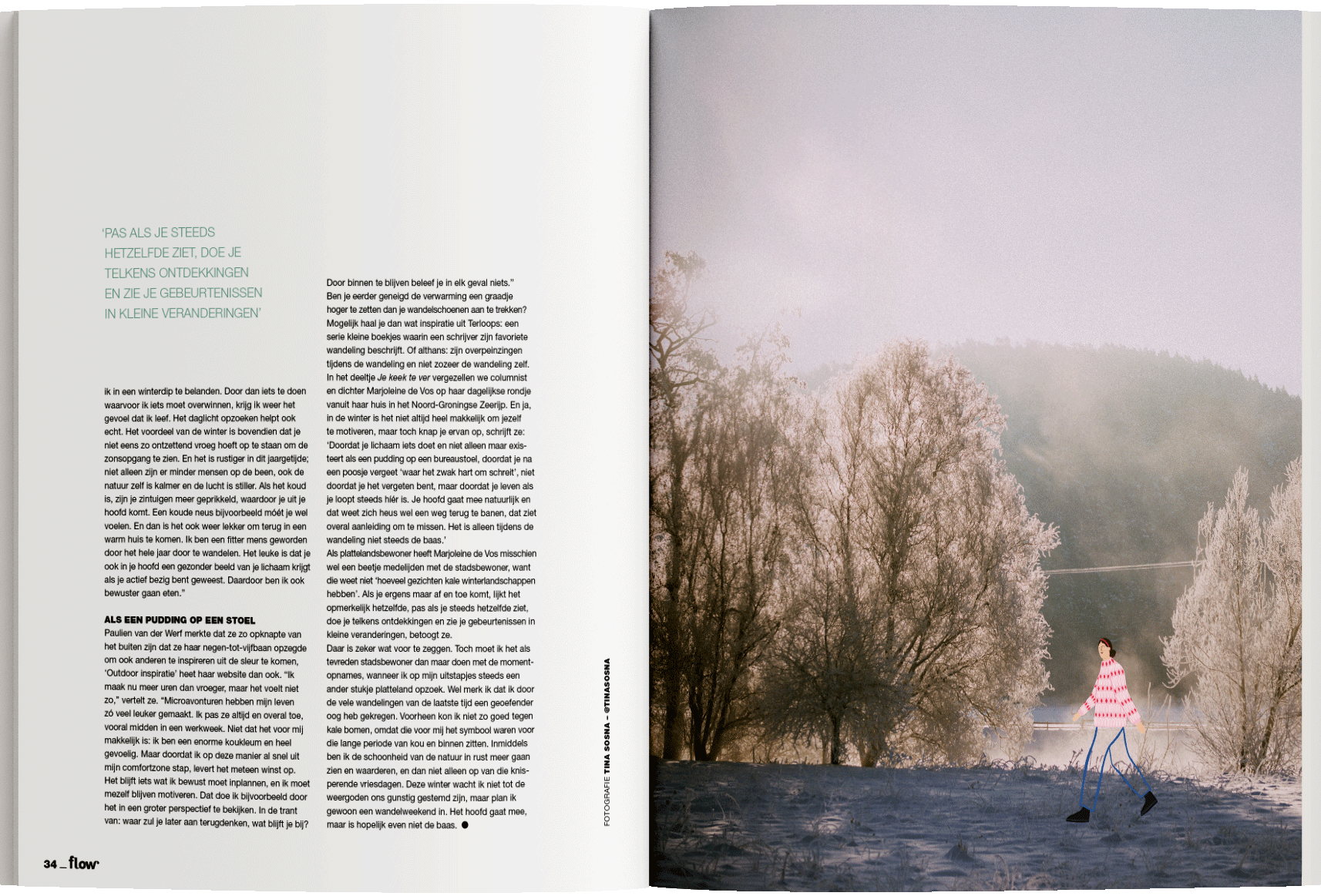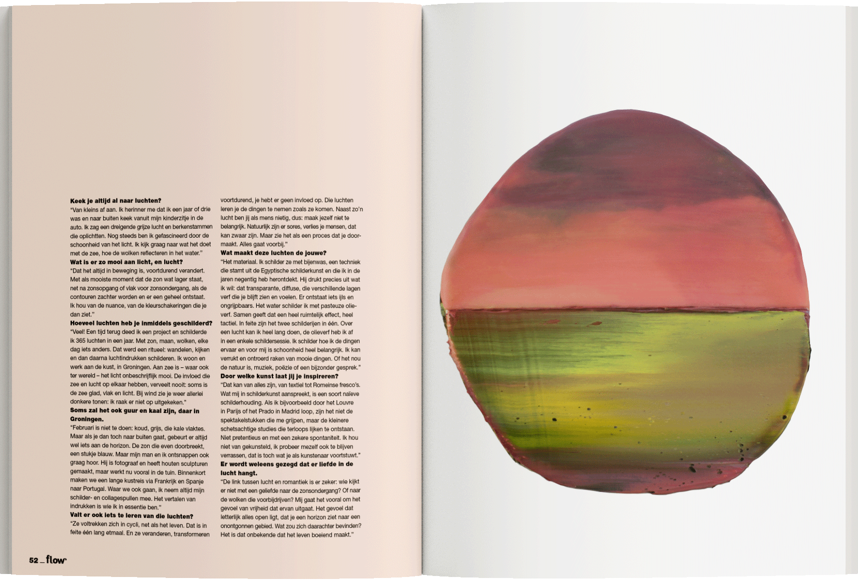 Beschrijving: Voor Flow magazine hebben we art-direction en vormgeving gedaan. Flow is een magazine met aandacht voor creativiteit, eenvoud en mentale gezondheid. Per nummer worden de kleuren en beeld- en illustratiekeuze zorgvuldig afgestemd op de artikelen om een samenhangende en inspirerende leeservaring te creëren.